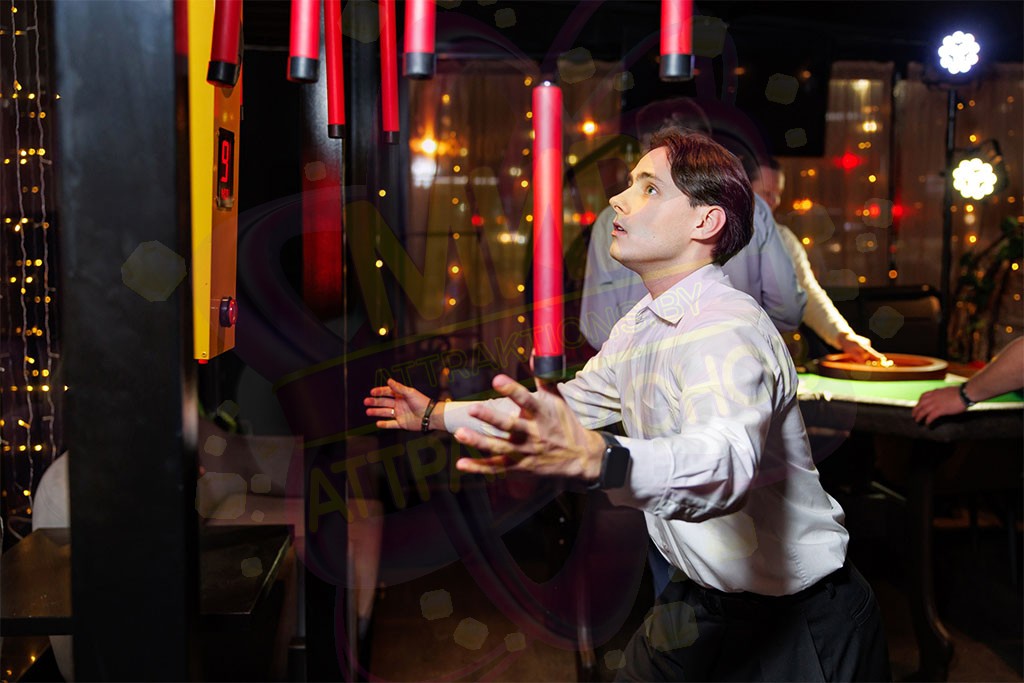 Основной принцип игры – скорость реакции и ловкость движений. В начале раунда игрок занимает удобное для себя положение в центре дуги. Жмём красную кнопку – и игра началась! Стержни начинают поочерёдно и внешне рандомно падать вниз. Задача игрока – одним чётким молниеносным движением схватить падающий элемент и бросить его в корзину, расположенную перед участником. 1 раунд – 10 падающих стержней. Сколько удалось словить, такой и итоговый результат.